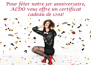 Les célébrations du 1er anniversaire de mon blogue se poursuivent avec un 6e concours! Aujourd’hui, c’est ALDO qui vous offre un certificat-cadeau de 120$ pour vous gâter… parce qu’il n’y a rien qui fait autant de bien que s’acheter une nouvelle paire de chaussures;)