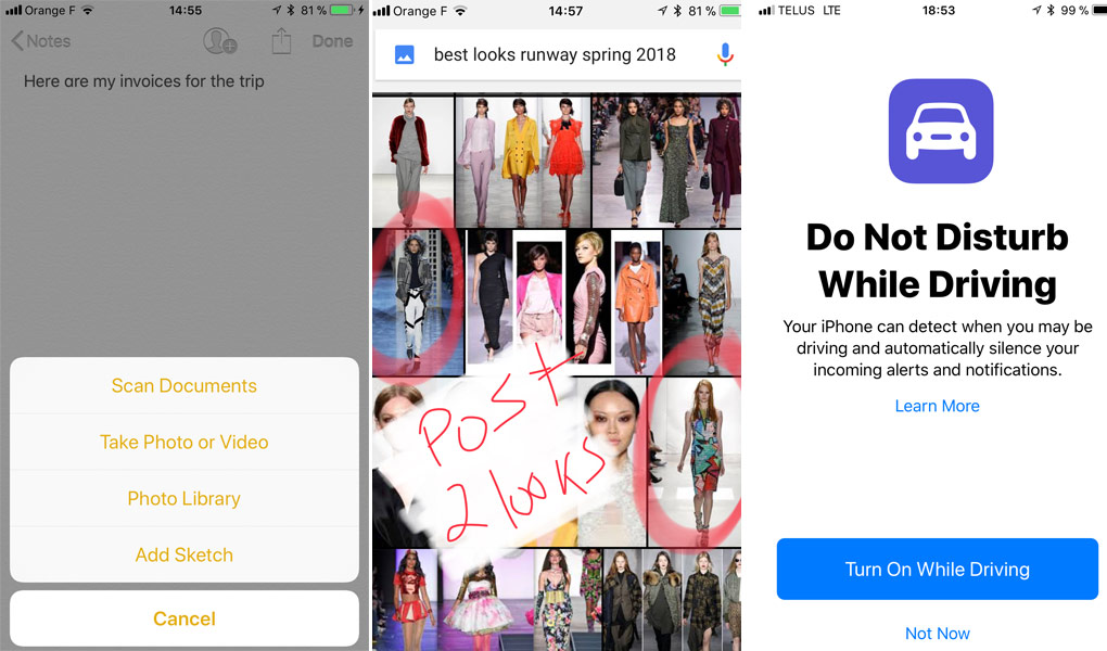 Après les photos, ce que je fais le plus avec mon iPhone sont des tâches pratiques comme… faire ma comptabilité, effectuer des virements, scanner des documents et prendre des notes. Et je suis contente de voir que je peux encore mieux le faire avec mon nouvel iPhone! On peut en effet maintenant scanner des documents et factures sans app, il suffit d’appuyer le « + » quand on est dans Notes, et on pourra le faire en un clic. Encore mieux, la possibilité de prendre des petites notes sur une capture d’écran. C’est très intuitif: on fait une capture d’écran, elle s’ouvre dans une deuxième case et on peut directement écrire dessus et envoyer à notre collègue par exemple!