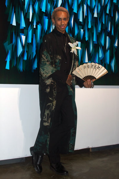 Quand j’ai vu Miles, j’ai adoré l’idée du kimono imprimé (Renata Morales) porté sur un complet noir Philippe Dubuc. Et puis l’ajout du corsage et de l’éventail sont top!