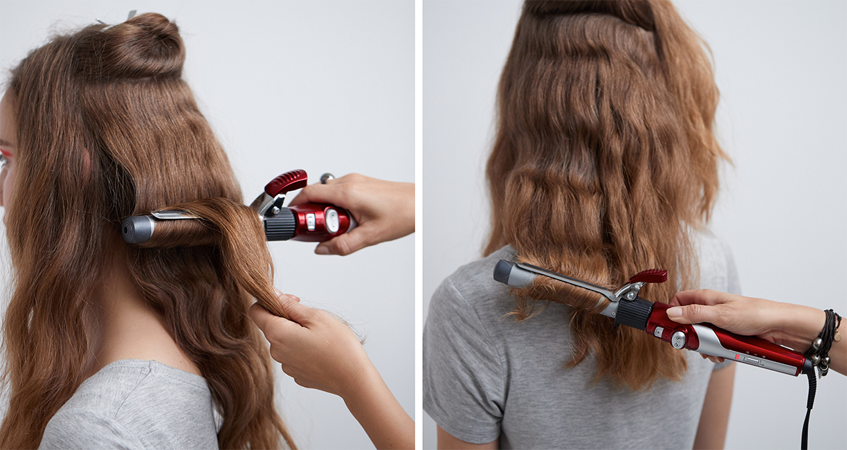 Étape 1 : Pour des ondulations au style rétro, choisissez un fer au diamètre assez large (fer You Curl – 42,99$). N’enroulez pas la mèche au complet sur le fer. Au contraire, commencez à la racine, pincez le fer en place et laissez le quelques secondes. Recommencez quelques centimètres plus bas.